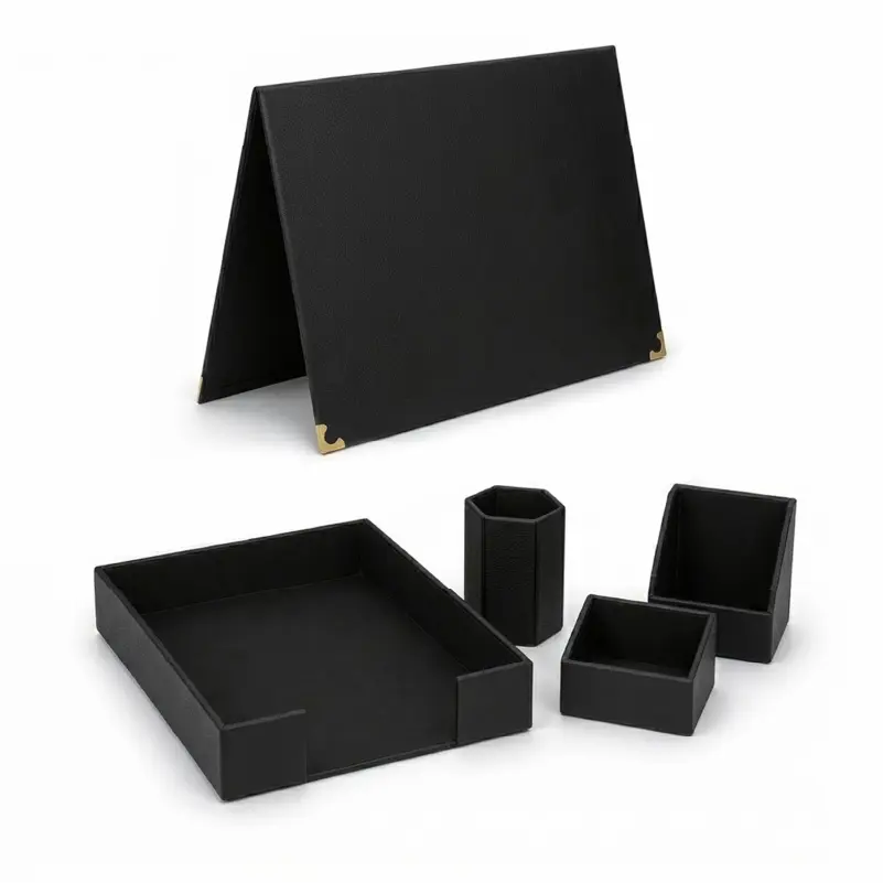Cet Ensemble de Bureau Cuir comprend plusieurs éléments indispensables : un sous-main confortable pour écrire, un panier à courrier pour classer vos documents, un porte stylos pour garder vos outils à portée de main, un porte cartes de visite pour vos contacts professionnels, un bloc cube pour vos notes rapides et une corner box pour optimiser le rangement. Chaque élément a été conçu pour améliorer votre organisation quotidienne.